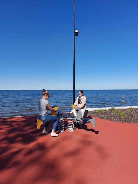 Järgmiseks peatuspaigaks oli Sillamäe Mere puiestee ja rannapromenaad. 2020. aastal valminud promenaad kulgeb mööda merekallast, soe ilm tegi jalutuskäigu väga mõnusaks. Külalisõpilased käisid vaatetornis, õpetajad eelistasid vaadet nautida madalamalt. Koos sai ka kiikuda laste mänguväljakul, korjati põnevaid kive ning katsuti merevett, mis vaatamata külmale kevadele oli väga soe.