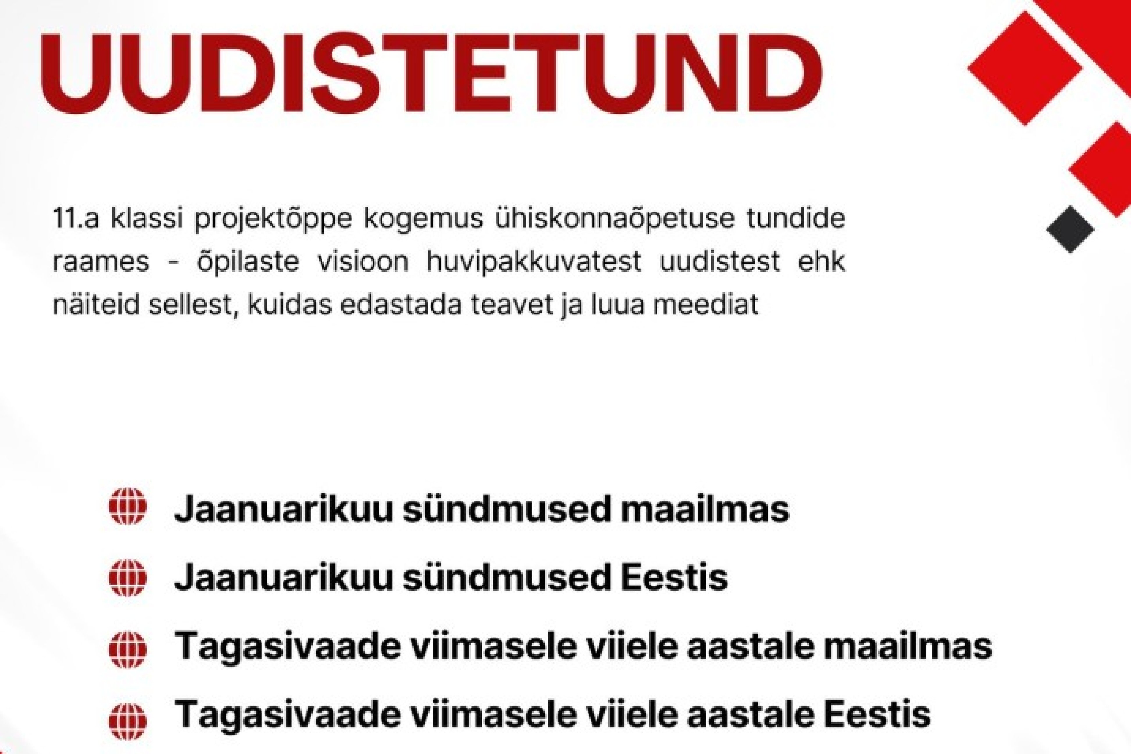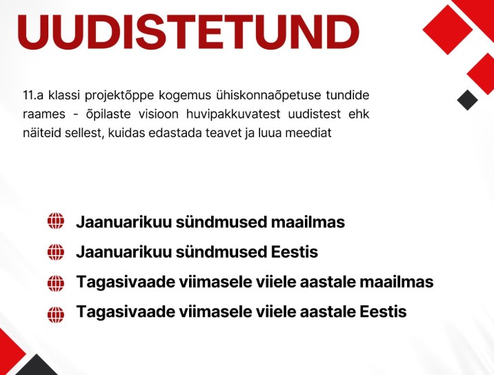 9. veebruaril esitles Jõhvi Gümnaasiumi 11.a klass kooli aatriumis ühiskonnaõpetuse tundide raames loodud uudistesaateid ja ajakirja.