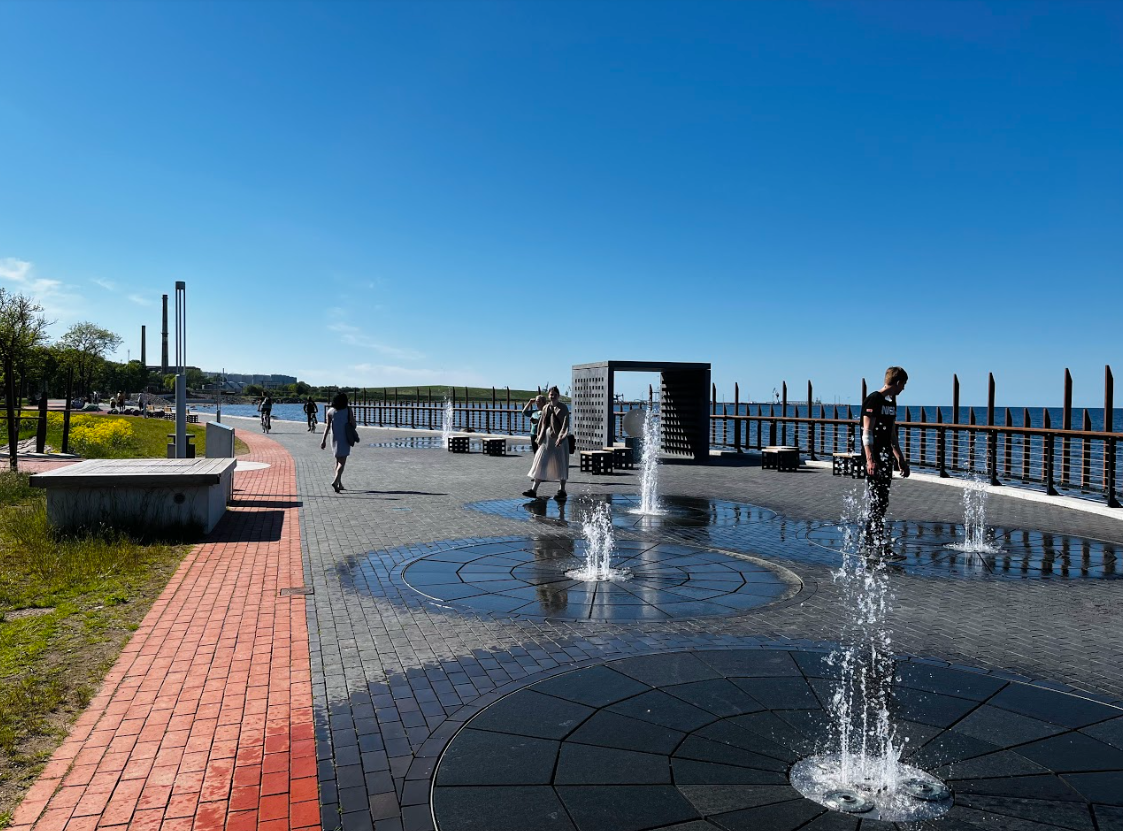 Järgmiseks peatuspaigaks oli Sillamäe Mere puiestee ja rannapromenaad. 2020. aastal valminud promenaad kulgeb mööda merekallast, soe ilm tegi jalutuskäigu väga mõnusaks. Külalisõpilased käisid vaatetornis, õpetajad eelistasid vaadet nautida madalamalt. Koos sai ka kiikuda laste mänguväljakul, korjati põnevaid kive ning katsuti merevett, mis vaatamata külmale kevadele oli väga soe.