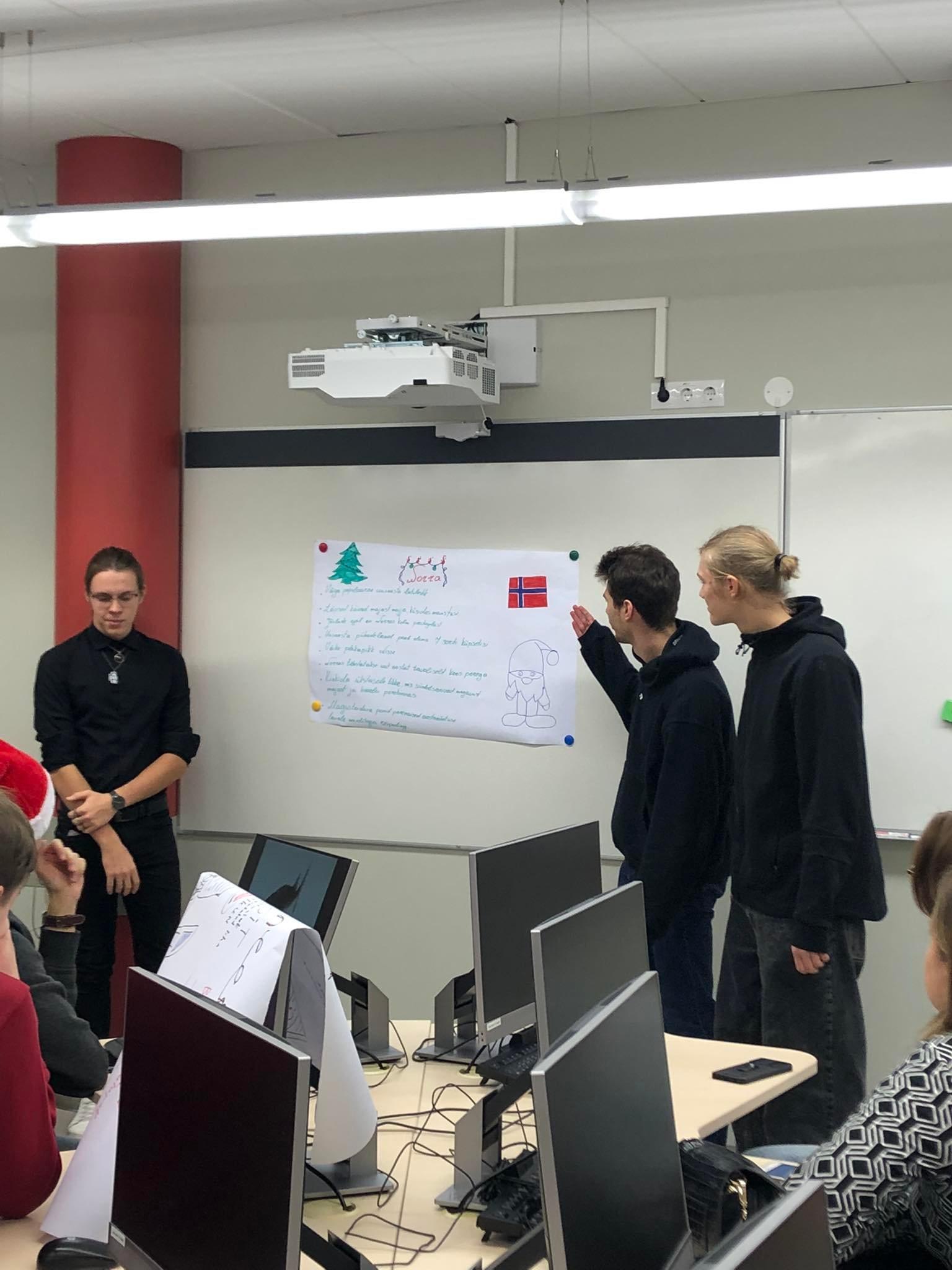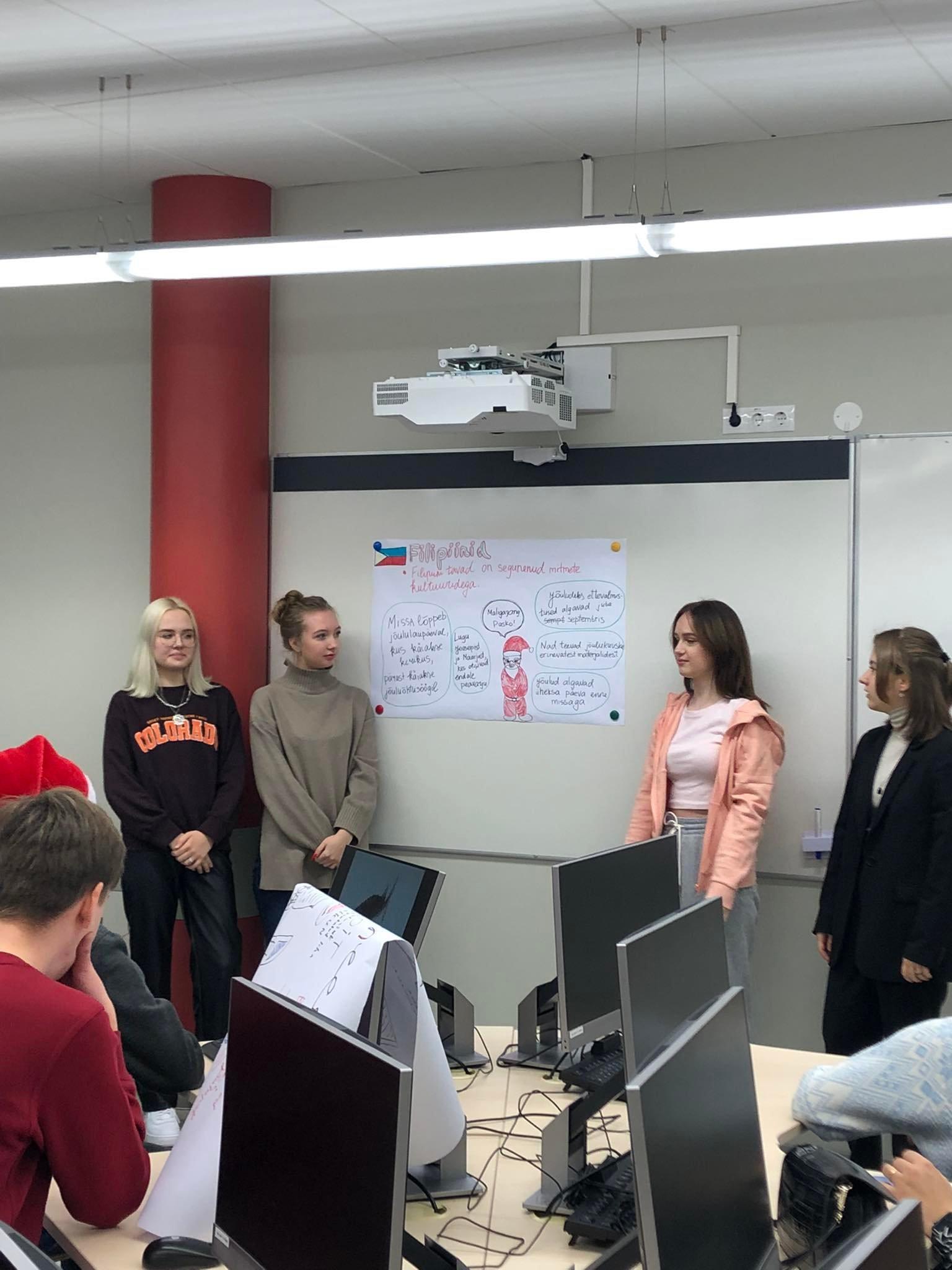 Õpilased otsisid rühmades infot, kuidas tähistatakse jõule maailma eri paikades, tegid postrid ning esitlesid teistele. Saime väga palju uut ja huvitavat teada maailma riikide jõulukommetest.