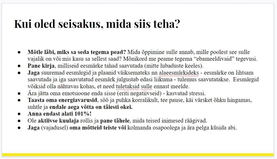 Katrin jagas kogemusi enese leidmisest, oma mõttemustrite muutmisest, oma hirmudest ja nende lahendustest. Avas ukse minapildi kujundamise poole ja rääkis selle seosest motivatsiooniga ning lõpetas nõuannetega, kuidas seisakust üle saada.
